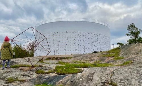 A new Kruunuvuorenranta neighborhood is being built on the opposite bank of Katajanokka, just a few kilometers from Market Square as the crow flies. Serving as a landmark for the residential area being built on the site of the old oil port is a unique attraction – a light art installation created in an old oil storage tank, Oil Tank 468, which shines at the tip of Kruunuvuorenranta during the dark seasons. During the summer months, this white giant can also be spotted from passing cruise ships and from the Suomenlinna ferry. The area around the oil tank is also an outdoor recreation area open to all, and picnic tables can be found in front of it for outdoor meals. From the oil port shore, there are views to Suomenlinna, Katajanokka, Korkeasaari, and Kalasatama's tower buildings. In spring 2022, a small temporary K-grocery store also opened on the shore.