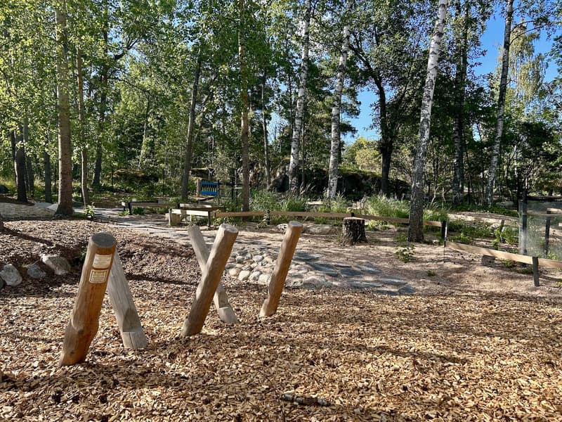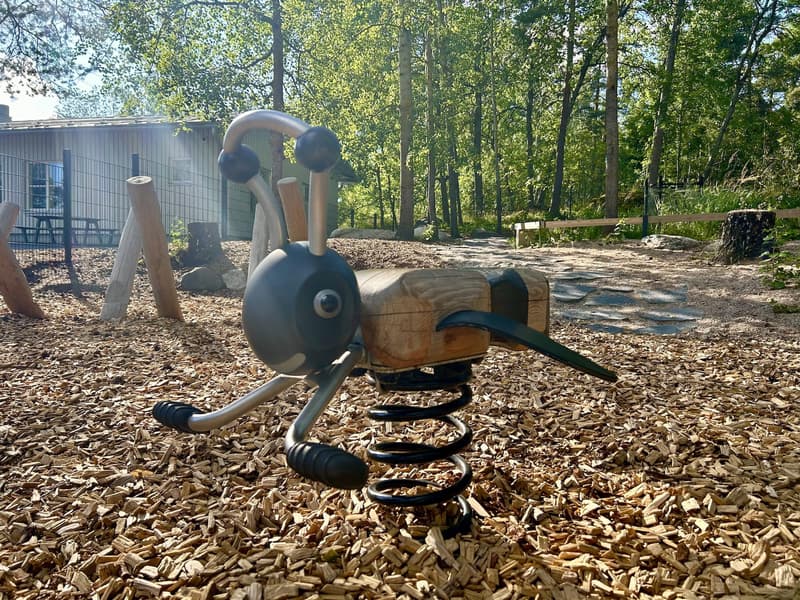 The best aspects of Hilleri Playground are the wooded playground built around the garden theme, where spaces are divided among different activities. The playground also fits well into the landscape and the area is peaceful, with the surrounding park area providing additional space for the playground. There are also shady spots. Among the animals you can meet here are the playground's mascot, a wooden cloudberry sculpture, and clever ants.