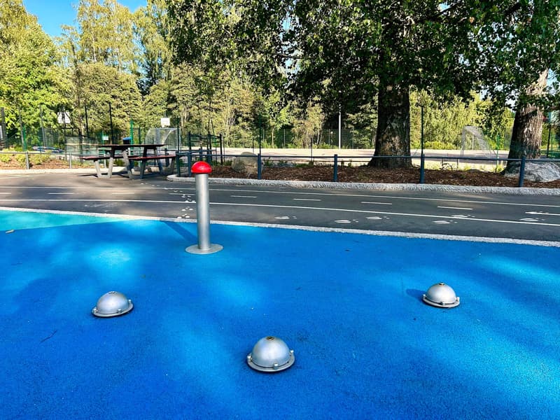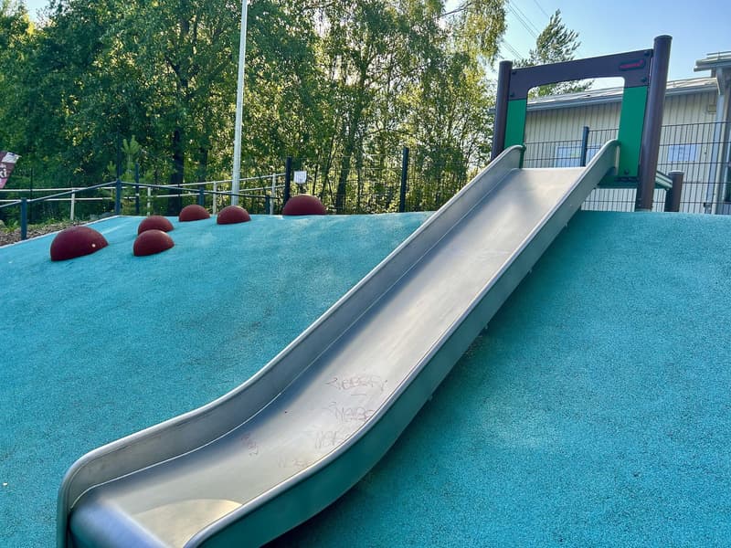 On Hilleri Playground's upper courtyard, there are familiar elements from Venynpuisto playground, but in a smaller size: the slope area is covered with rubber mulch, creating good conditions for climbing and the playground's slide. There is also the playground's water element, a water gauge, which was not in use at the time of our visit.