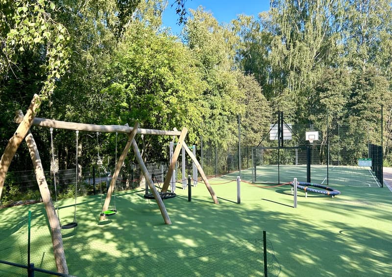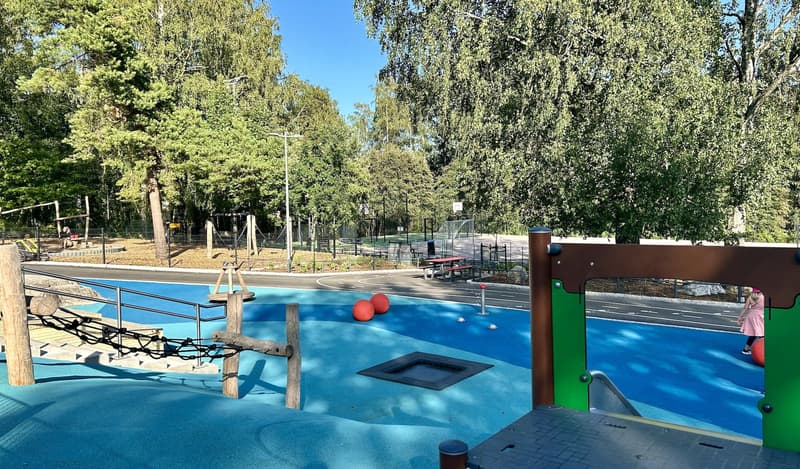 Hilleri Playground features various swings, two trampolines, climbing structures and a slide, sandbox, seesaws, a water play area (available only during limited playground hours), a bicycle track, horizontal bars, a carousel, and other various play equipment. Next to the playground you can find a skating and scooter area as well as a sand surface field. One of Hilleri's play areas is fenced. Hilleri Playground also offers supervised activities on weekdays during playground hours.