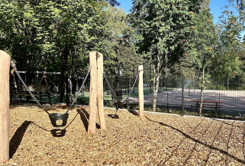 Like many other recently renovated Helsinki playgrounds and play areas, Hilleri's courtyard features mostly wooden playground equipment from Kompan. The courtyard is also divided into sections and at least one area is fenced. The playground is distinguished from others by its layered design and closeness to nature; here too, children of various ages have been considered.