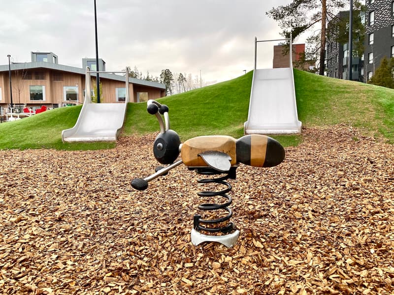 The playground has been renovated with mostly wooden play equipment from Kompan, like many other newly renovated playgrounds and play areas. As a special feature, Mellunmäki Playground has an owl that serves as both a climbing structure and a slide – something that has previously been seen in new Kompan playgrounds abroad. The owl is definitely the playground's main attraction and an impressive one at that, and it seems to be popular with children. We've already nicknamed it the owl playground!