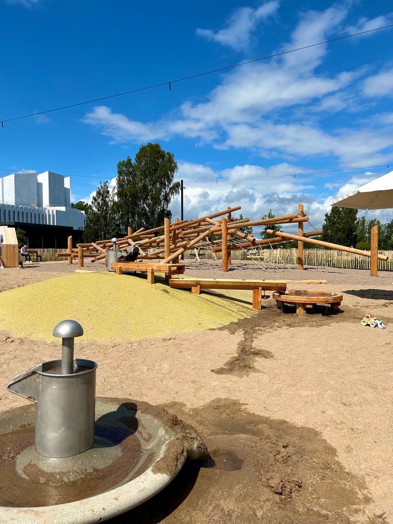 Töölölahti Summer Park's playground is a small part of a larger park area and consists mainly of wooden play equipment and small cottages on beautiful beach sand. The main attraction of Töölölahti Summer Park's play area is a small water play zone! Three water points on soft sand, plus in the park there are (still under construction fencing at the time of photography) a few water fountains that rise from the ground and can be adjusted. The absolute draw of the summer park's playground is its location in central Helsinki.