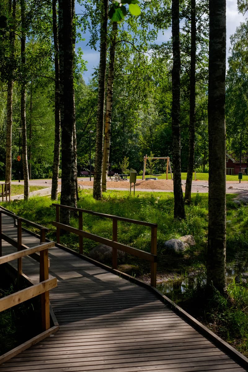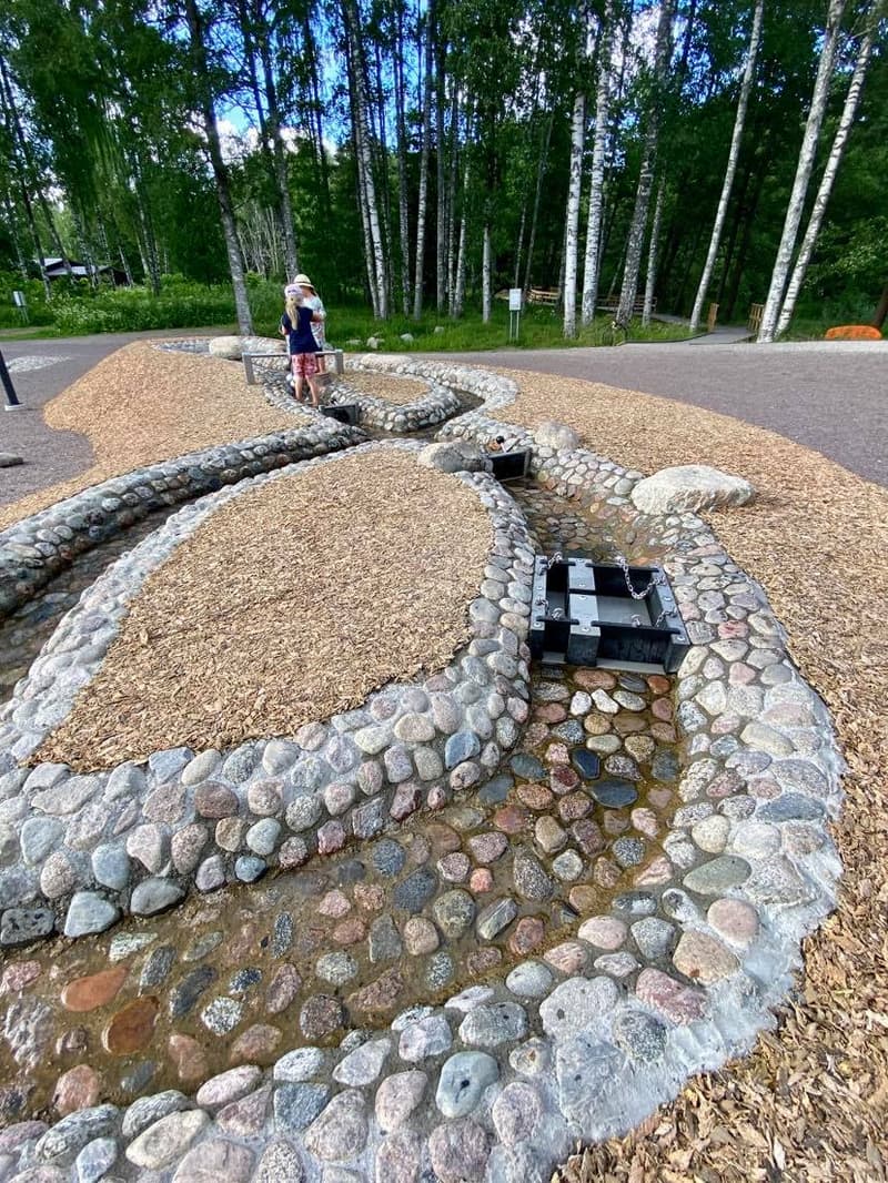 On the side of the canal near Helmen, we discovered a brand new playground. **The playground named Children's Experience Park** was small but wonderful: a little slide, a basket swing, trampolines, and a water play area where children could play and experiment with how the canal works. The water play could have been even more fun if we'd had a small toy boat with us (a tip for the nearby shop to stock small plastic boats ;)). We spent a long time here and there were also excellent picnic spots in the Vääksy River area.