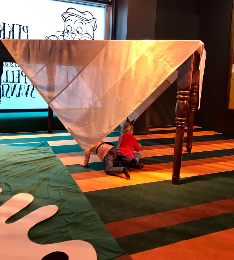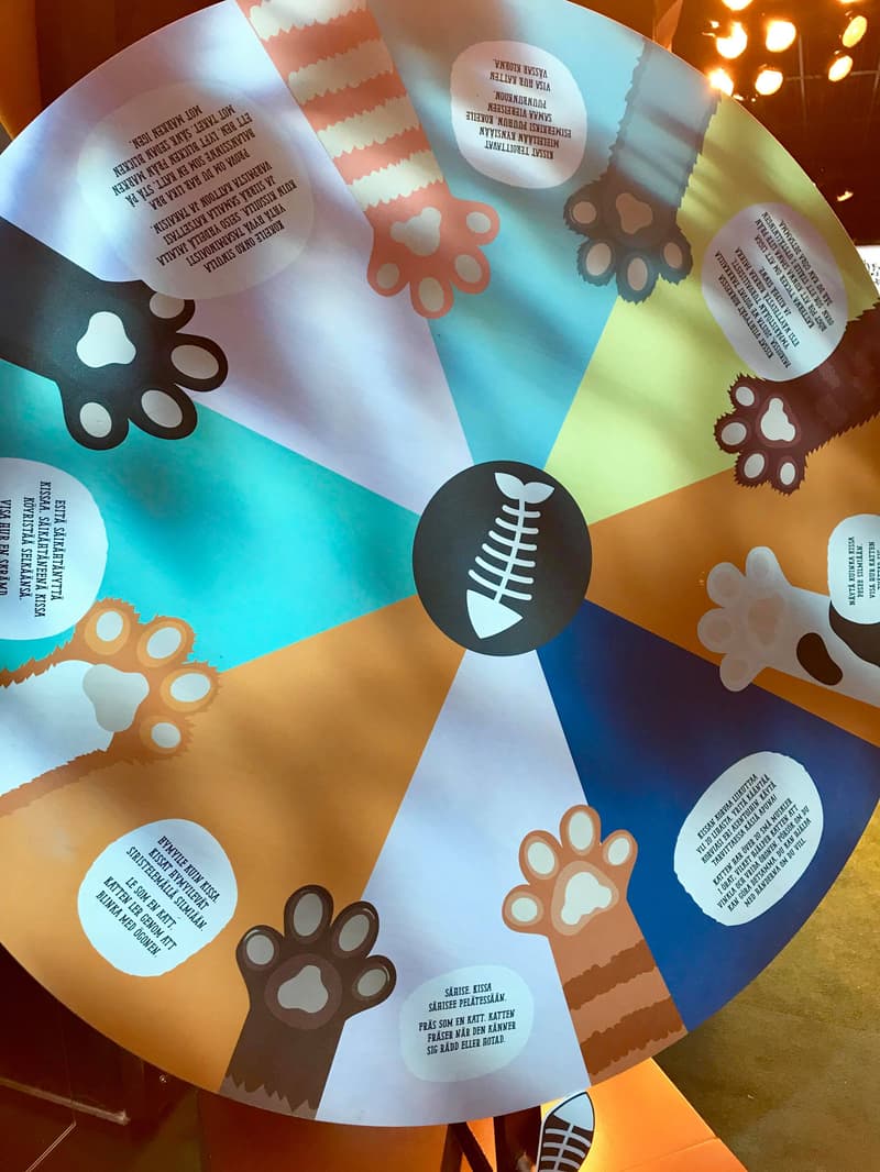 The Pekka Töpöhäntä exhibition can be experienced in many ways: exploring as a cat, spinning tasks from a wheel of fortune, reading stories, and getting excited about Monni's coal cellar. For this reason, I dare recommend the exhibition for all young visitors: my two-year-old museum buddy enjoyed being a cat and rolling the ball of yarn, my five-year-old got excited when Monni hissed again and climbed on a high chair and spun in the somersault corridor. However, Monni's coal cellar was discussed all the way home—apparently it was a little scary. In the exhibition, we also learned that cats can do somersaults, they have excellent balance, and they love to climb in high places.