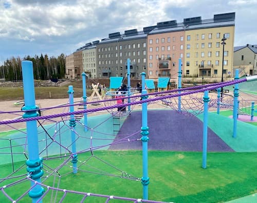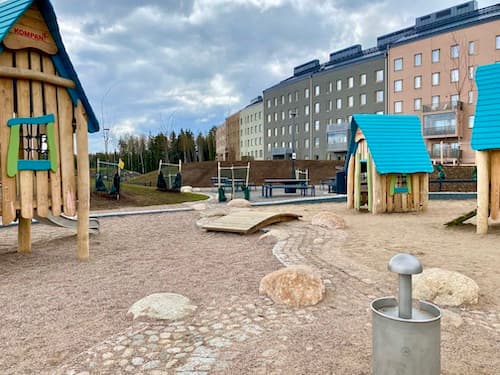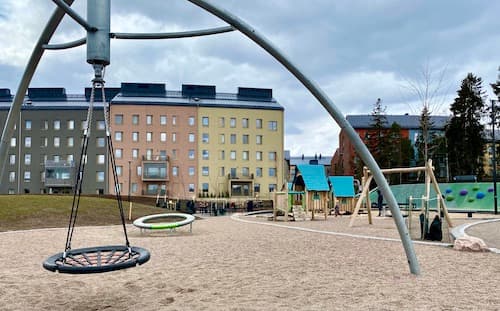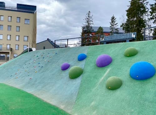 At the beginning of 2021, a brand new and unique playground by Helsinki's standards opened next to Vennyn Park in the new Kuninkaantammi residential area, with climbing as the main feature. Vennyn Park has several different climbing routes with a very unusual design. In addition to climbing, Vennyn Park also has an area suitable for younger children and, judging by the structures, a water play area during the summer months. A special feature of the playground is an outdoor grilling area with picnic tables, so you can also visit here for a picnic with your own food. This park can also be recommended for older children. The overall setup is quite successful and different: we'd like to see more of these in Helsinki!