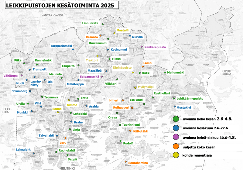 Playgrounds Arabia, Brahe, Ida, Kotinummi, Lahnalahti, Laurinniitty, Maasälpä, Munkki, Mustakivi, Mäkitorppa, Nuoli, Nurkka, Strömberg, Taivallahti, Torpparinämäki, Trumpetti and Viiri (Viiri closed earlier than planned on 19.6.2025). Summer meals are organized at MLL's Family House Unikko from 2.-27.6.2025 (no lunch at Unikko on 6.6. and 20.6.2025).