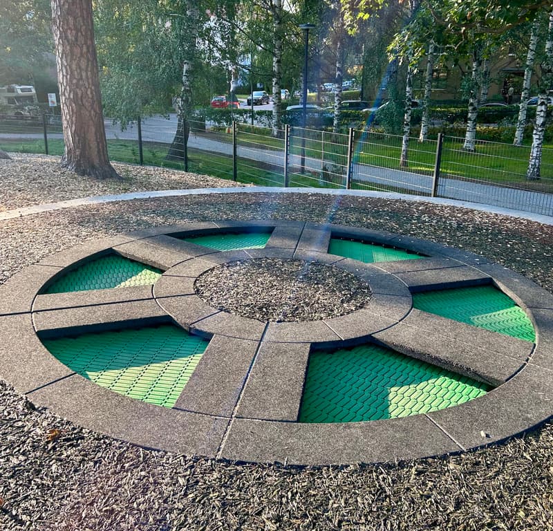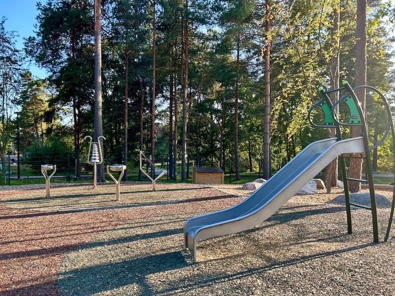 In addition to the swing and climbing frame, the park named after Sibelius naturally also has musical instruments and particularly well-sounding ones at that. There is also a sandbox with an excavator, a collection of several small trampolines (Pienten Helsinki's young critics did say the trampolines weren't the best possible in this park though), a separate baby swing, and a small slide. The playground, located among large conifers and sheltered by a rock outcrop, was a wonderful experience in the August evening sun at least. Behind the park, on the other side of the fence, there is also a separate outdoor gym.