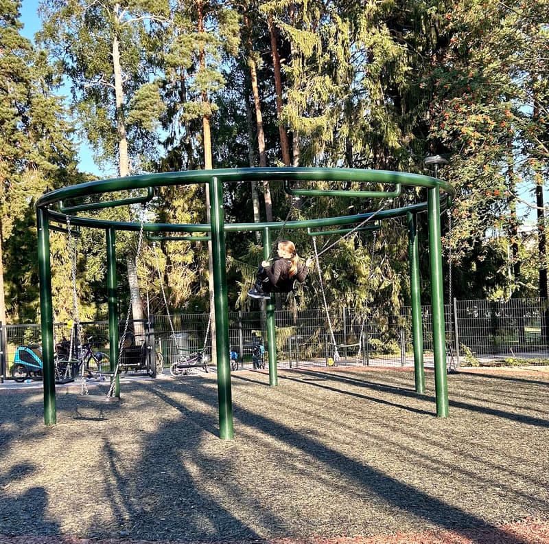 Another attraction is a group of six swings, a circular swing element similar to the one in Lovisholm Park in Sörnäinen but smaller. This is nice, although the placement creates a small challenge near the entrance gate. With small children, you need to be careful here, as there are swings in several places. An adult can also fit in this swing and at the time of testing it was very popular among different age groups. Unfortunately, there is no baby swing in this swing structure, but the playground does have one separate baby swing on the side.