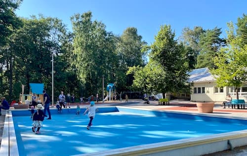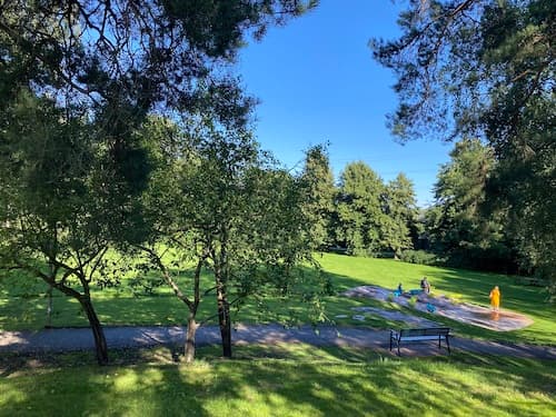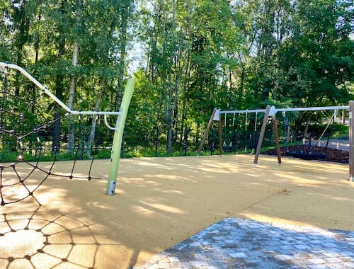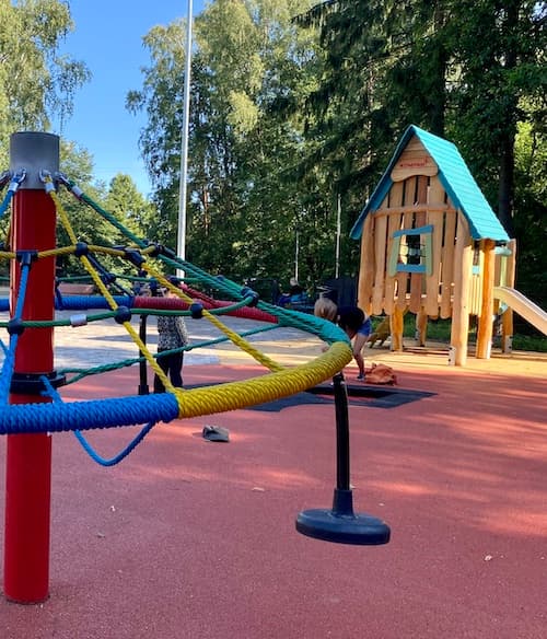 The upper courtyard of Squirrel Playground is fenced and shaded at least partly by surrounding trees and bushes. A large park area nearby is perfect for picnics or a more relaxed visit. Squirrel Playground's location close to Herttoniemi metro station is one good reason to stop by for play, as it takes only about five minutes to walk from the metro station to the playground. Parking is often available near the playground.