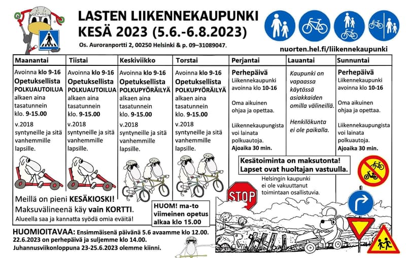 Children's Traffic City's summer season begins 5.6.2023 and ends 6.8.2023. Admission to Traffic City is free.