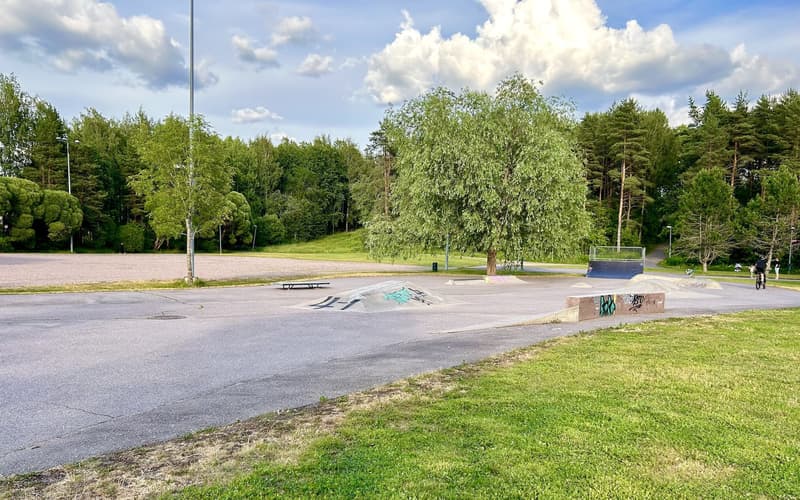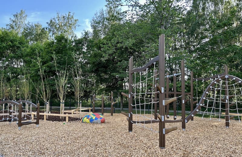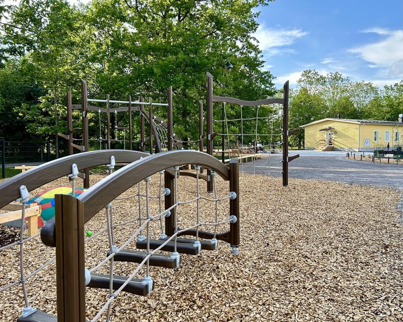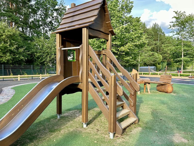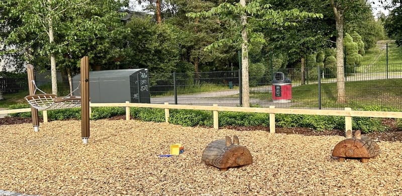 The Trumpetti Playground renovation has been built using wooden Lappset equipment familiar from previously renovated playgrounds, mainly in brown tones, with colorful asphalt paintings enlivening the space. The playground features, among other things, three different slides, climbing and exercise equipment for all ages, various swings, a sandbox and other play equipment, as well as the aforementioned wooden animal figures that children can sit on. In a corner of the playground there is also a small, separately fenced multi-purpose field for soccer and basketball games. Outside the play area and fence there are also two cable slides, a small skate and scooter park, and volleyball and sand court fields (these were not renovated as part of the renovation).
