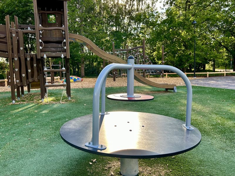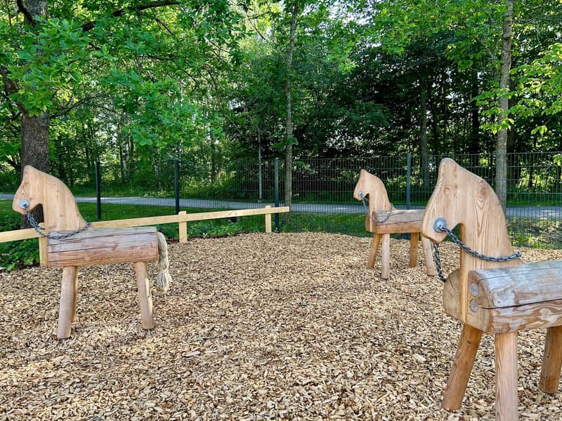 Located in Kannelmäki, the Trumpetti Playground's outdoor area still gleams with newness during our visit. The renovation work appears to be partly incomplete, judging by the tilt of at least one swing and possibly a carousel, but fortunately the rest of the playground looks great, and the warm summer evening has already attracted many children to this versatile playground. Despite its name, the Trumpetti Playground has not been built around a musical instrument theme, but rather features farm animals. Traces of the animals at the playground gates lead to wooden horses, pigs, cows, and sheep to climb on, swing from, slide down, and zoom along a thrilling cable slide. The Trumpetti Playground play area is fenced, and there is no separate area for younger children.