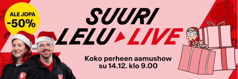 The whole family morning show is packed with Christmas hit gifts. Verkkokauppa's toy selection comes to life when this live broadcast tests and presents the most sought-after Christmas toys! During the broadcast you'll have a unique opportunity to shop from a dazzling wide selection of toys even at half price, and the screen will be filled with the favorites of good children and adults from Moomins to Hot Wheels, from plush toys to board games and smart toys to LEGO!
