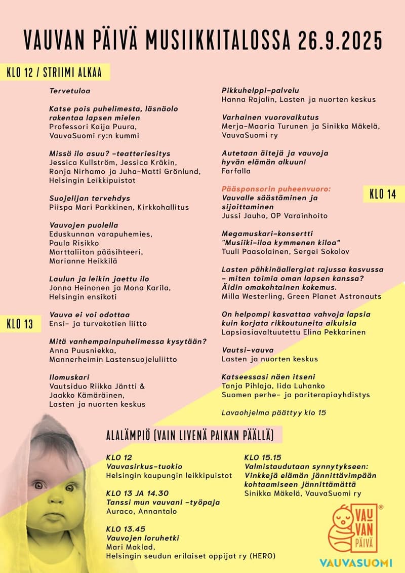 - Baby Day - Loru playground's program moves to the Music Hall's main event "Where Joy Lives?" - participatory music performance at approx. 12.00 on the Music Hall stage. - Helmet libraries' events for children can be found on Helmet's events page.