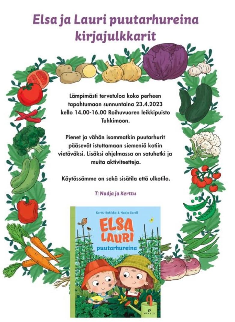 Elsa and Lauri the Gardeners book launches at Tuhkimo Park (Tuhkimontie 10-12) in Roihuvuori on Sunday 2-4 p.m. Free admission.