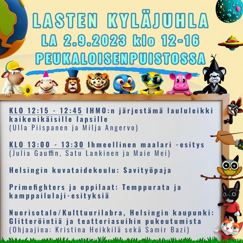 - Roihuvuoren Village Festival from Friday to Sunday. On Saturday, programs for all ages throughout Roihuvuori starting at 11 a.m. Children's village festival at Peukaloinenpuisto from 12 p.m. to 4 p.m. Free admission.