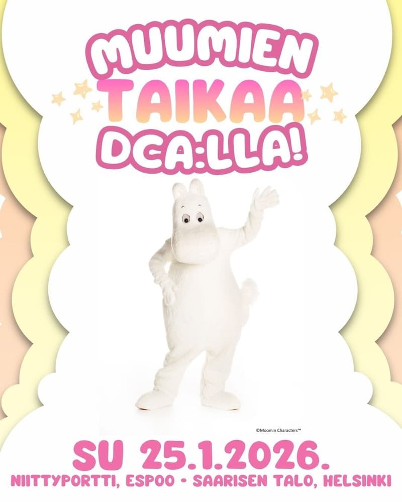 Advertisement / Commercial partnership with Dance School DCA. - A Moomin adventure arrives at DCA's Helsinki city center and Espoo locations on Sunday, January 25, 2026. The event is also visited by the beloved Moomin character Moomintroll! Free admission!